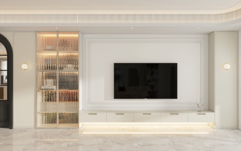 想空間不壓抑,左右對稱的餐酒柜柜門裝上長虹玻璃,忽隱忽現的美感更誘人。
