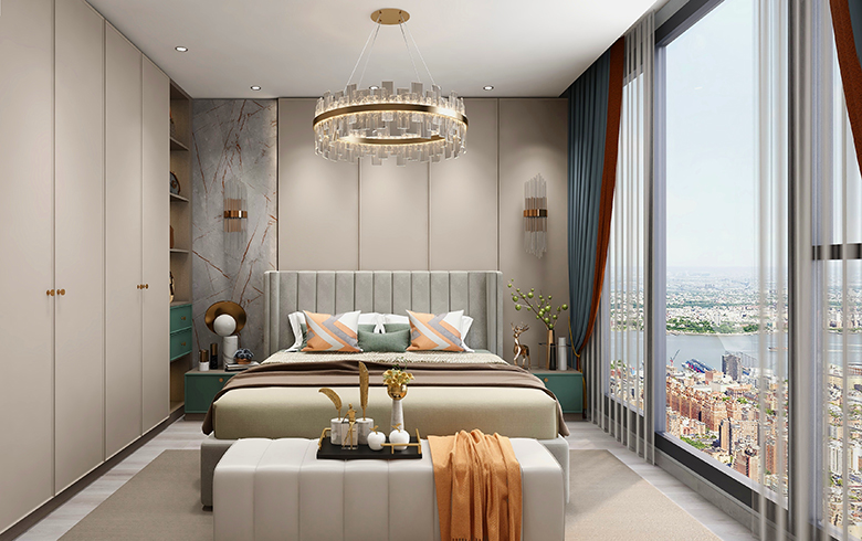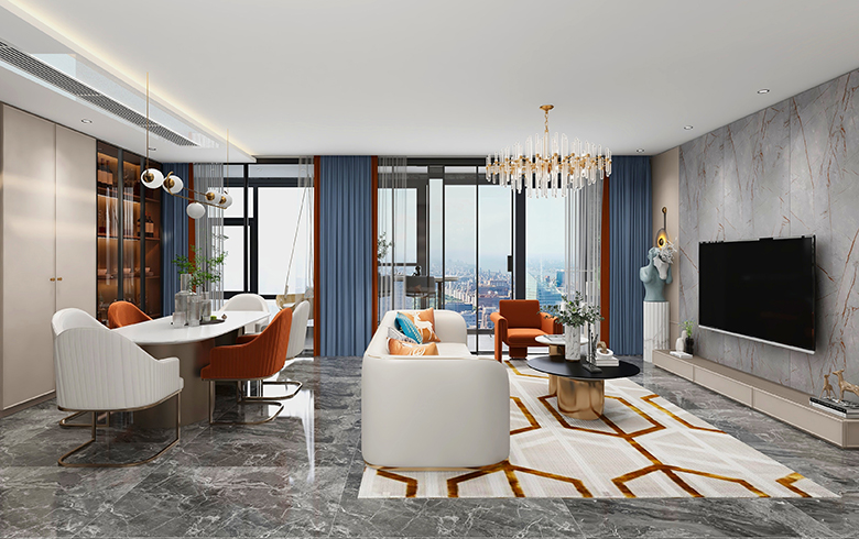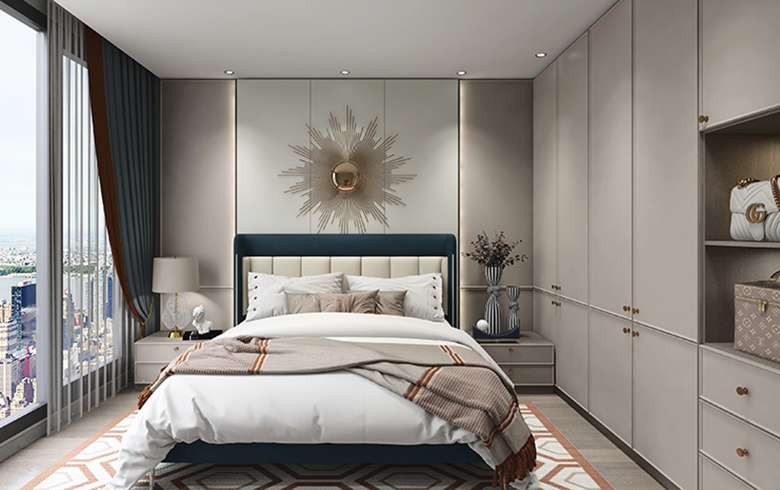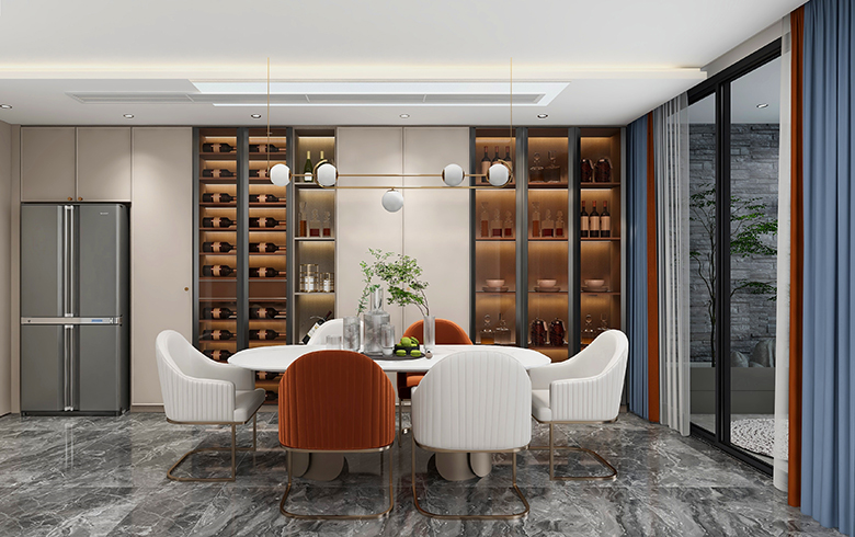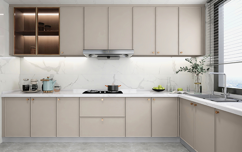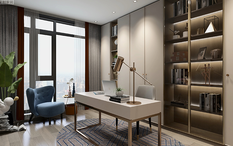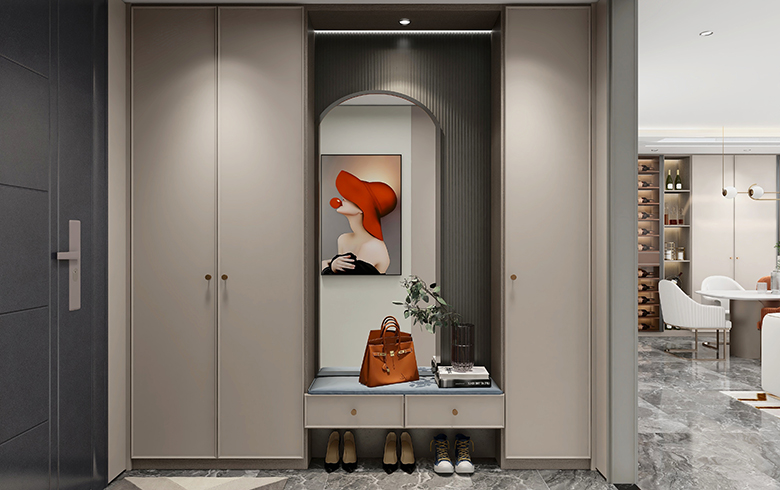 過道盡頭設計一排吊柜,“優雅暖灰”柜門混搭“流光漫步”柜體, “黑金剛”地臺搭配“慕尼黑”格柵板,酷尚而精致。