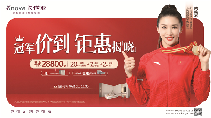 2023年6月15日,“618年中鉅惠|總部千萬(wàn)補(bǔ)貼計(jì)劃,定整家+999元惠送真皮床”618狂歡大促還在火熱進(jìn)行之際,卡諾亞將攜手花樣游泳世界冠軍陳曉君,重磅開啟“冠軍價(jià)到,鉅惠揭「曉」”超級(jí)直播活動(dòng),花樣游泳世界冠軍陳曉君攜花樣寵粉福利空降直播間,帶大家進(jìn)階高顏高品整家家居生活。